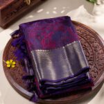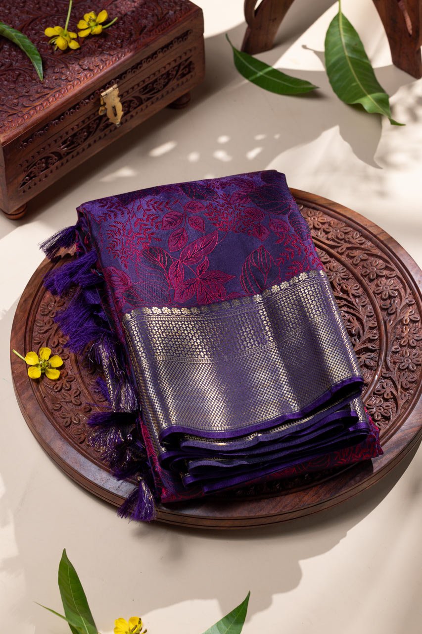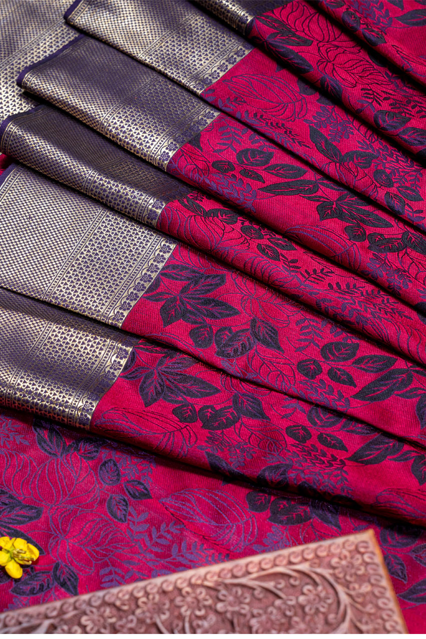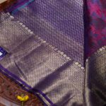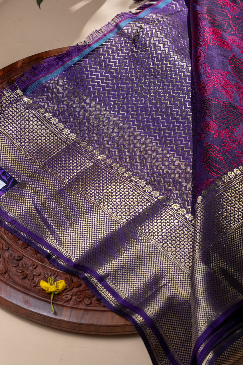 Experience the opulence of this Purple and Pink Kanchi Pattu Saree, adorned with intricate thread weaving. Paired with a stunning purple blouse featuring a woven chevron pattern in zari, this saree is the perfect blend of tradition and modern elegance for your special occasions.