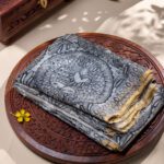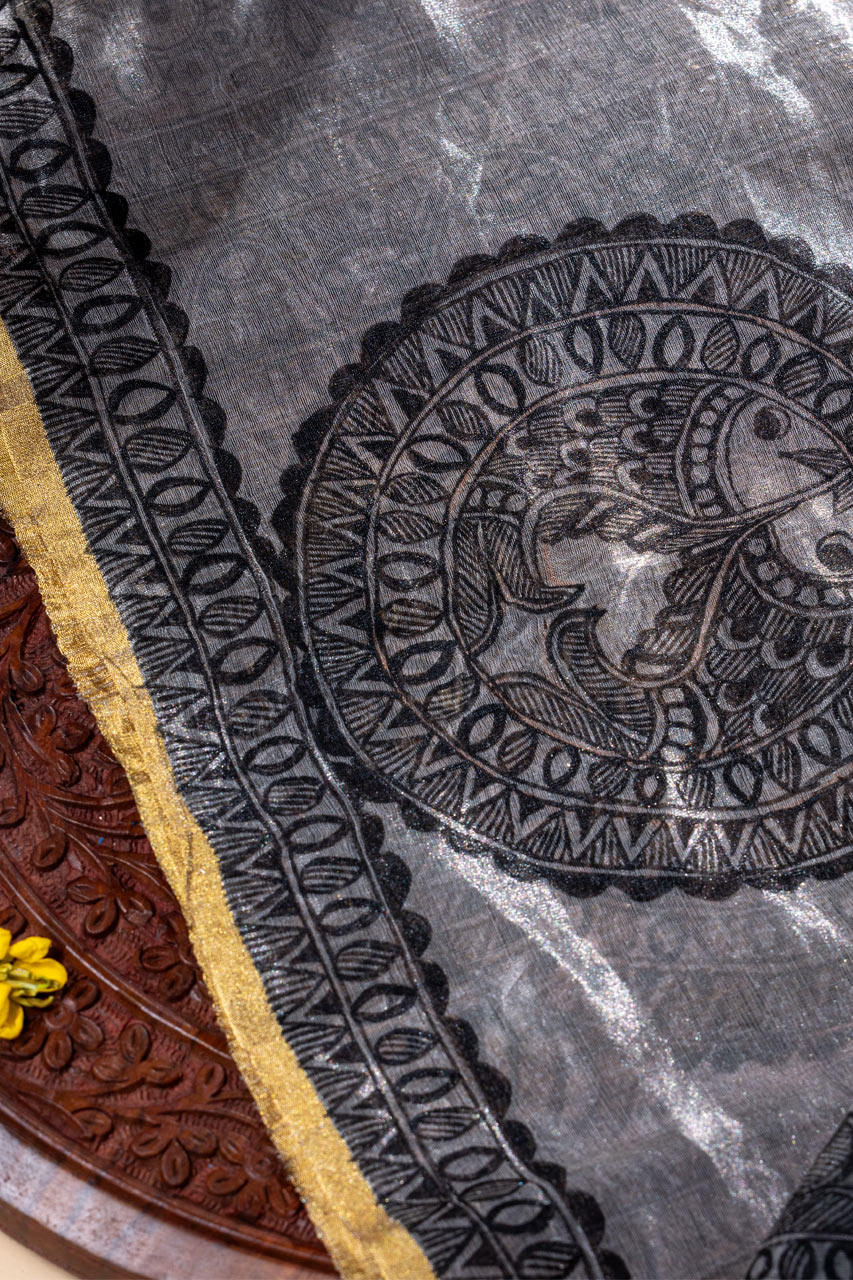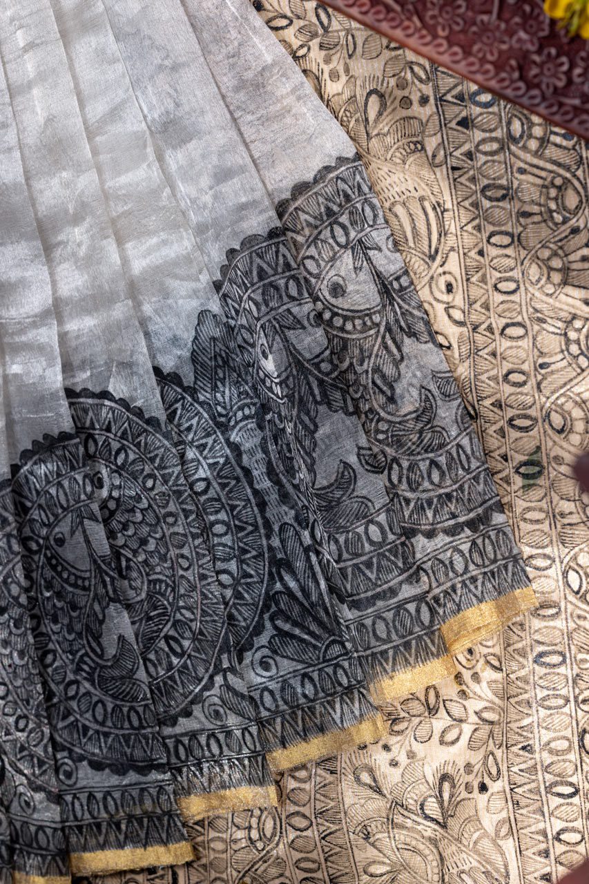 Adorn yourself with art in this Madhubani handpainted saree on a stunning silver tissue silk base. This handcrafted masterpiece celebrates the beauty of traditional art with a contemporary twist.