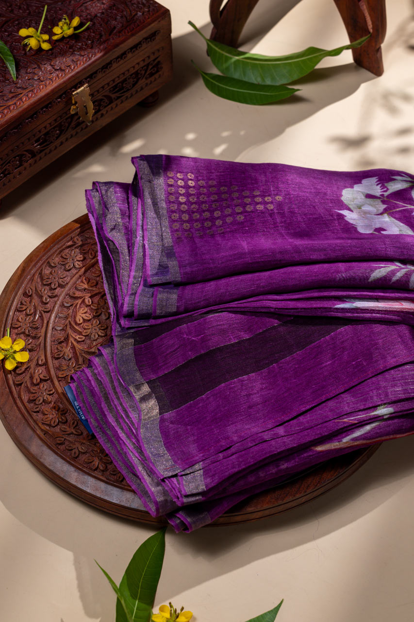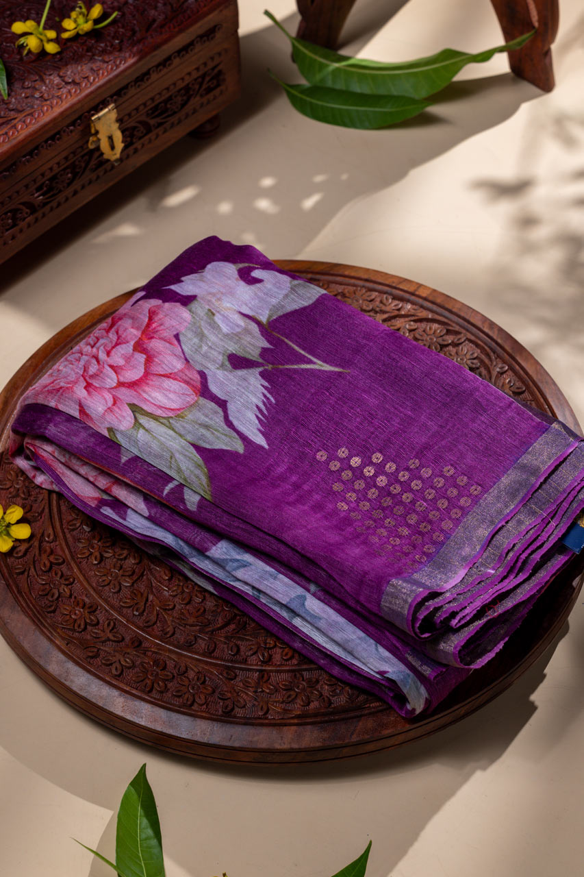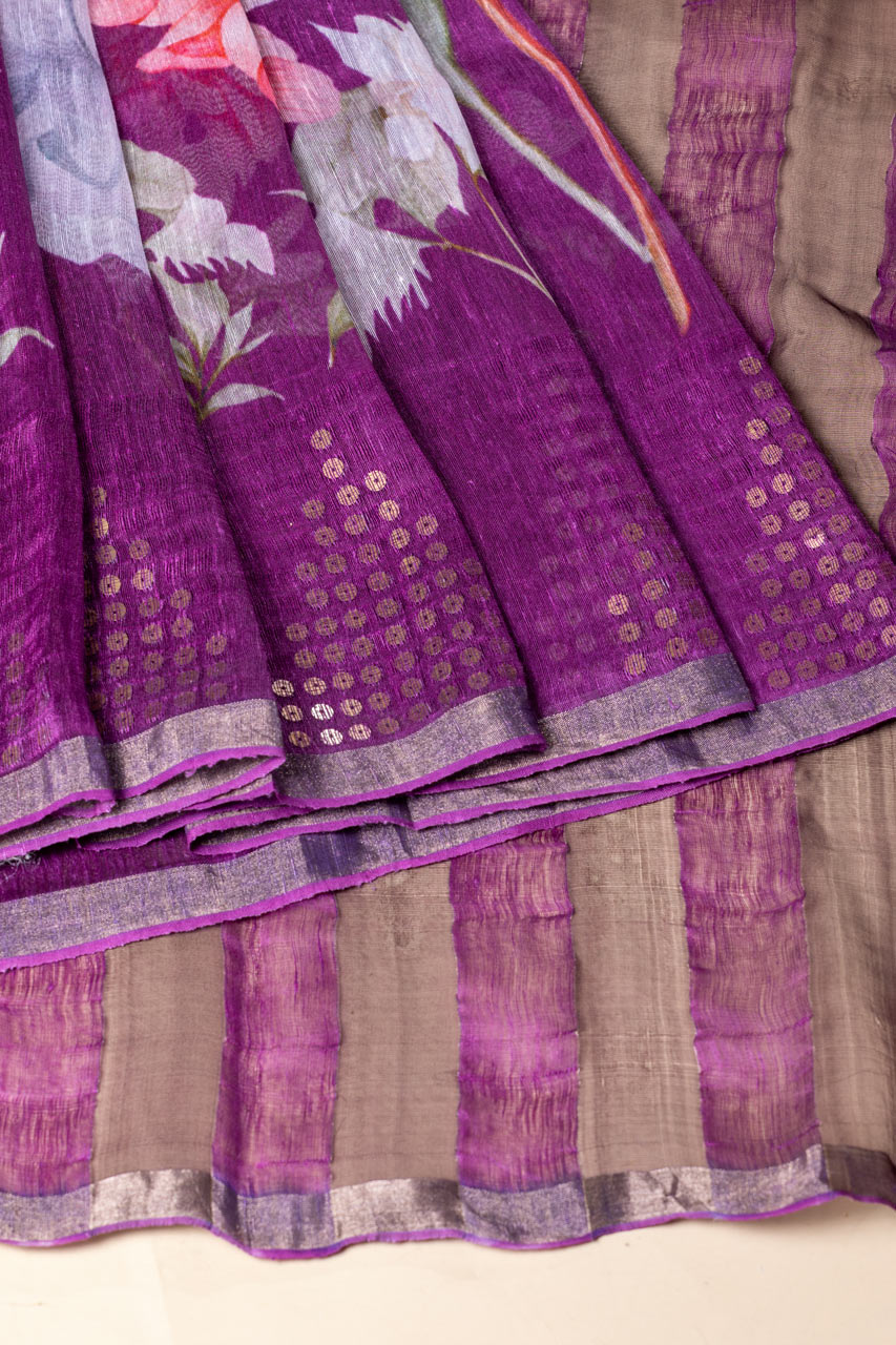 Celebrate the grace of florals with this Deep Purple Pure Kora Linen Saree. Adorned with a delicate floral print, the saree has a stunning sequence border that adds a touch of sparkle to the fabric. The pallu is a graceful mix of stripes, and the blouse is plain with a matching border. This saree exudes sophistication with a perfect blend of subtle hues and intricate details, making it ideal for festive occasions or cultural celebrations.