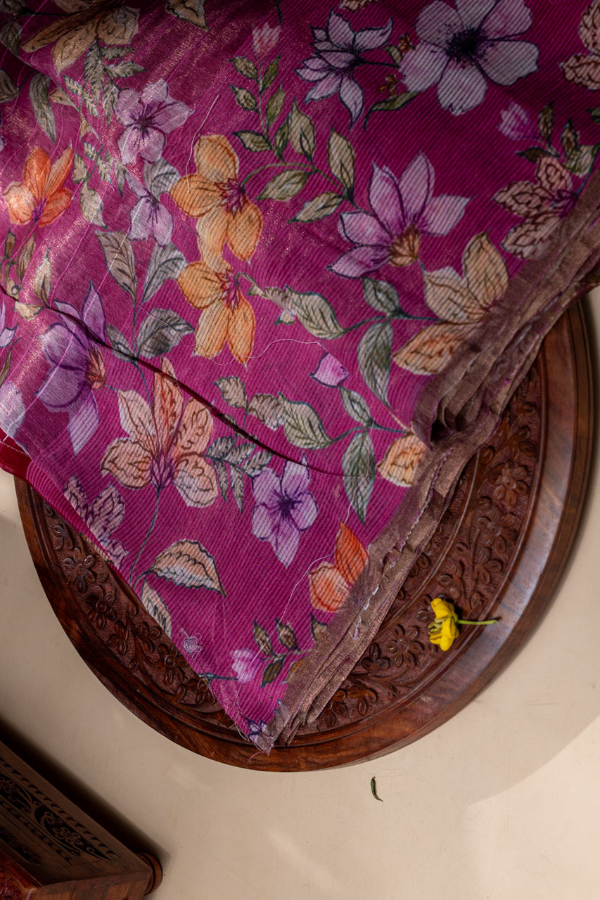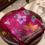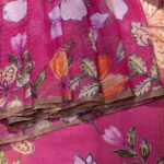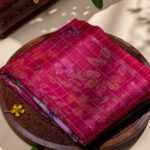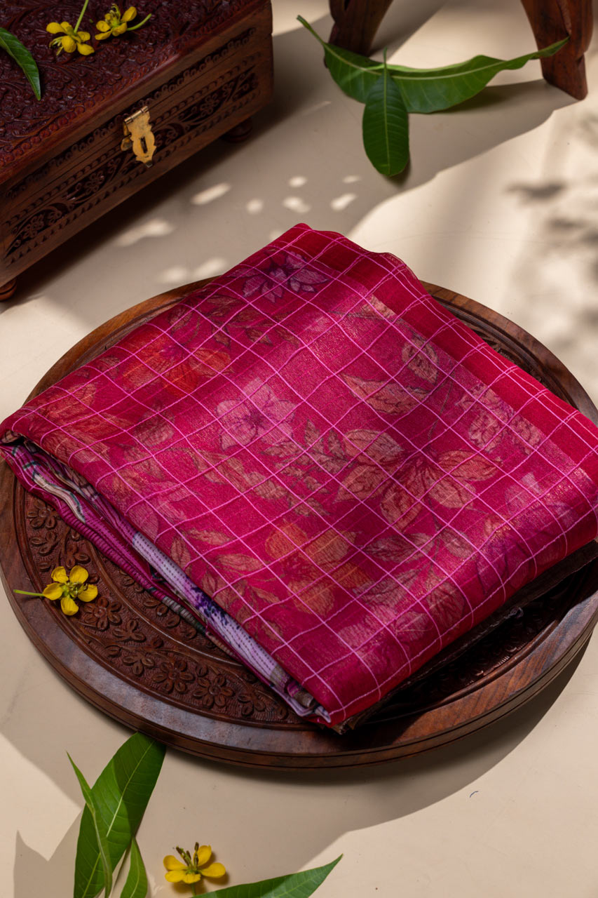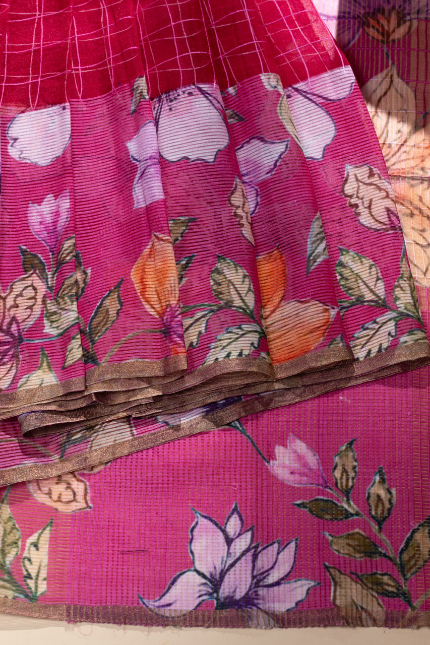 This Pink Pure Kora Saree brings together the elegance of checks with the delicate floral print. The pallu, blouse, and border all feature beautiful floral designs, contrasting beautifully with the checks on the body of the saree. This fusion of checks and floral motifs adds a fresh twist to the classic kora saree, making it a perfect pick for any special occasion.