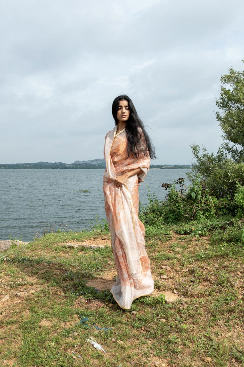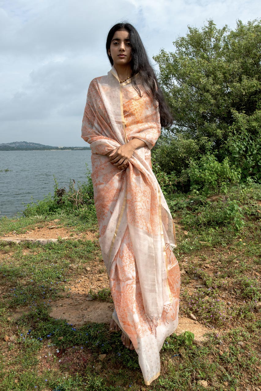 Unveil the elegance of tradition with our Pure Kora Saree featuring a delicate inlay sequin border. The saree is adorned with a subtle floral pattern in beige and peachish orange, offering a soft, sophisticated look. Paired with a Pure Matka Silk blouse in a peachish orange hue, this saree exudes a graceful charm, making it perfect for both festive and formal occasions.