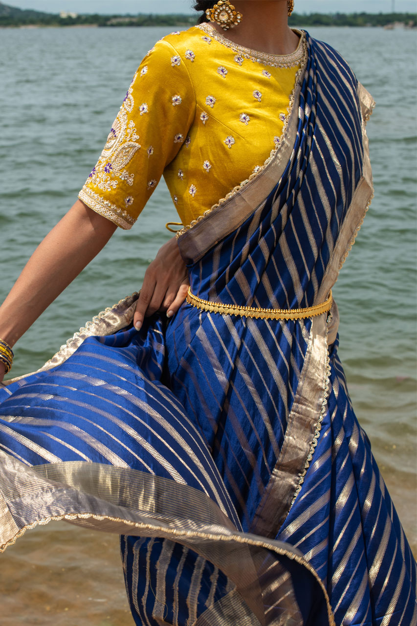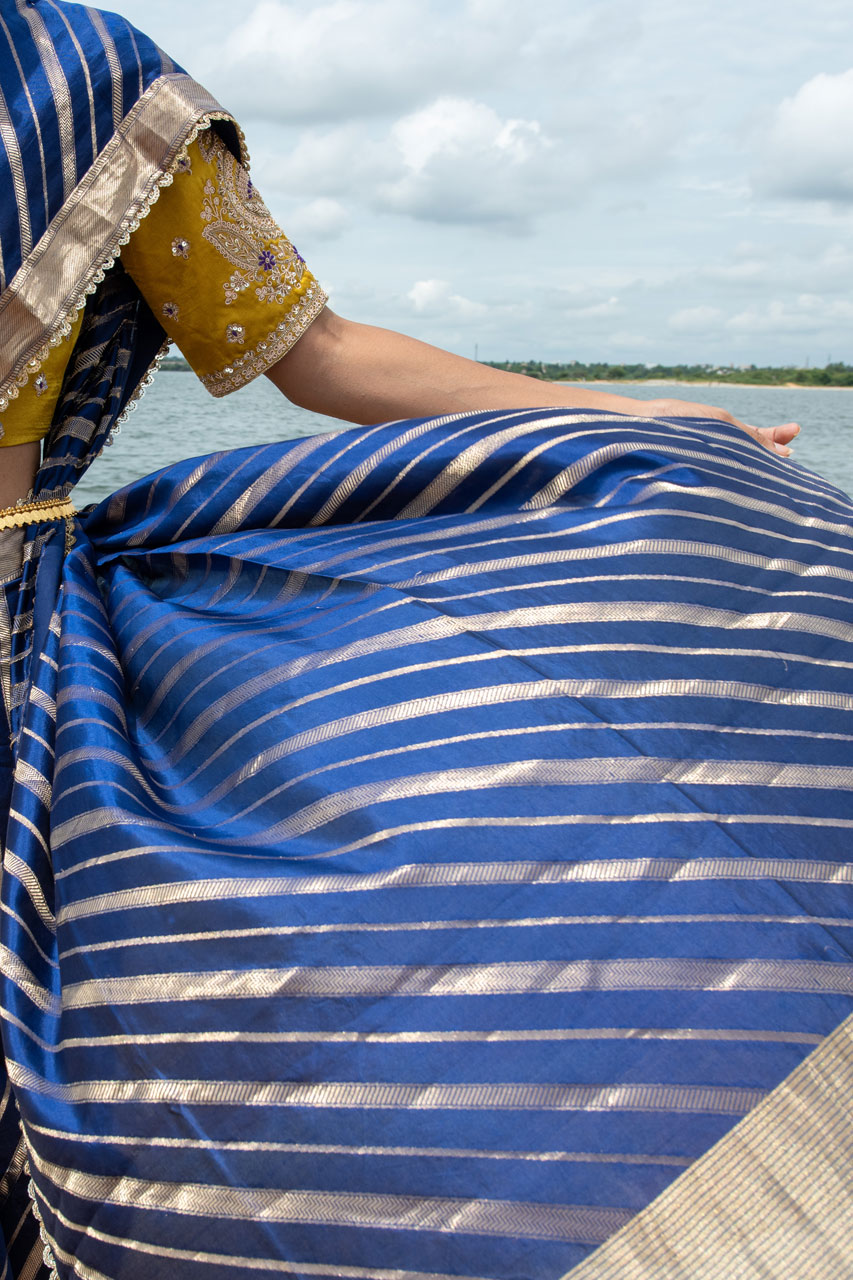 Indulge in the beauty of this Pure Katan Banarasi Silk Saree, featuring an exquisite leheriya pattern and a meticulously handworked border. With its dual blouse options, this saree offers versatility and elegance, making it a perfect choice for any special occasion.