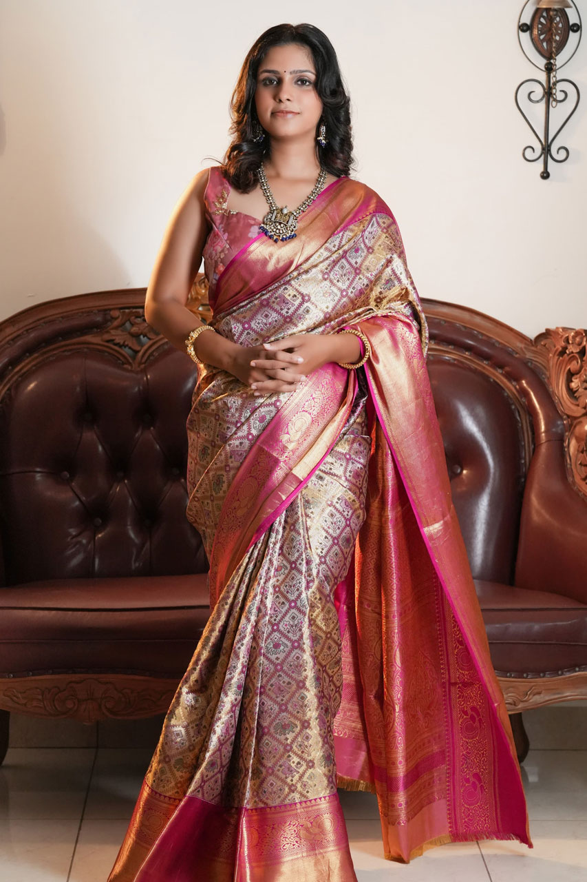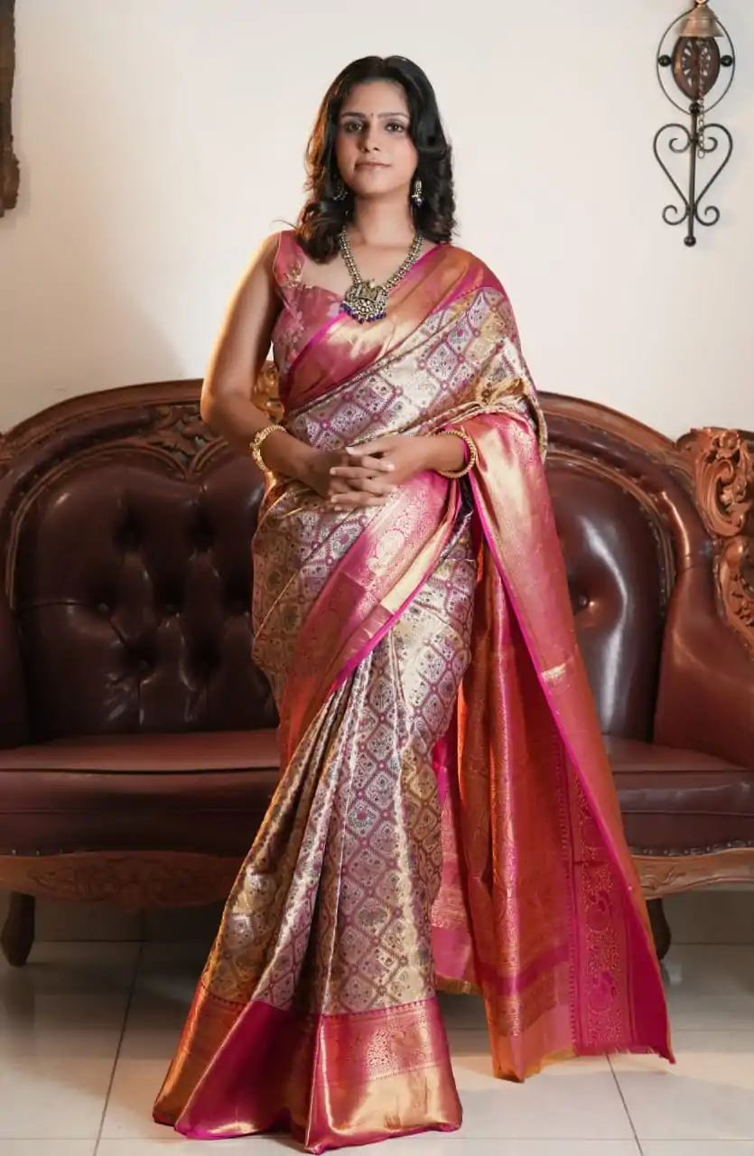 Embrace the rich heritage of this Pure Kanchipattu Saree, featuring an exquisite Patola design in a stunning pink hue. The intricate patterns and luxurious fabric make it a perfect choice for those cherished occasions that call for timeless beauty and tradition.