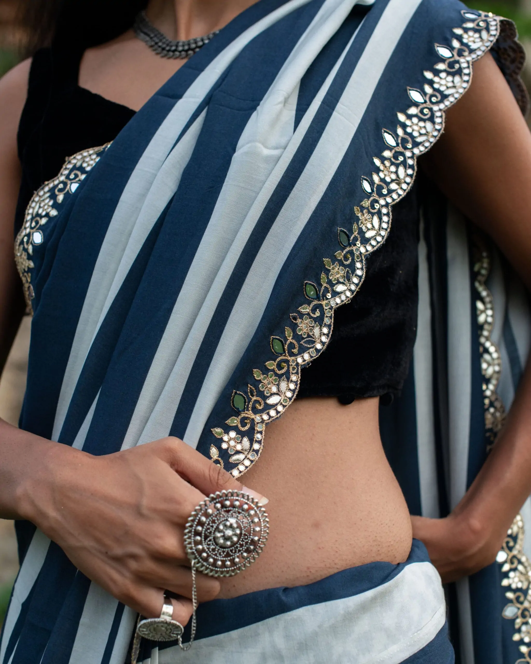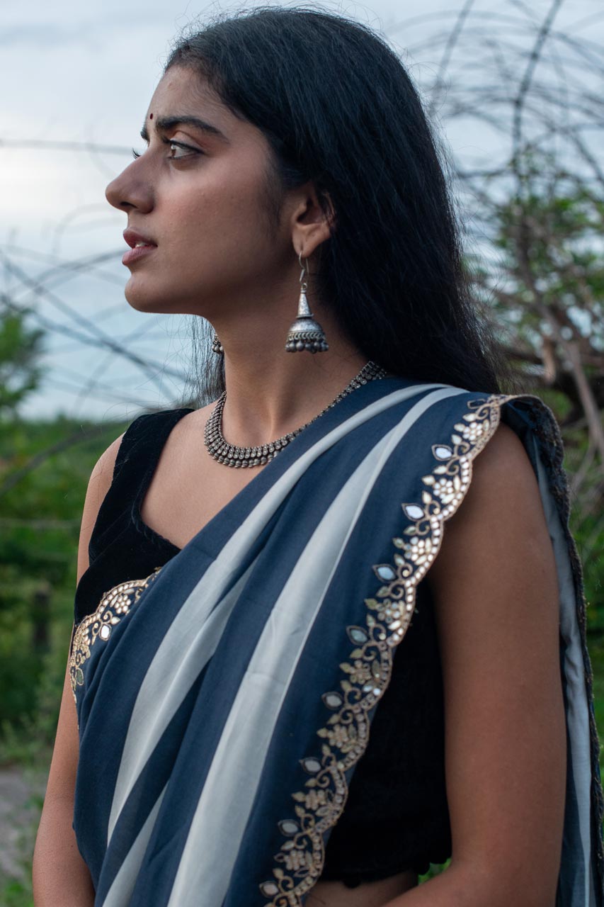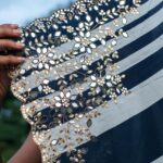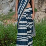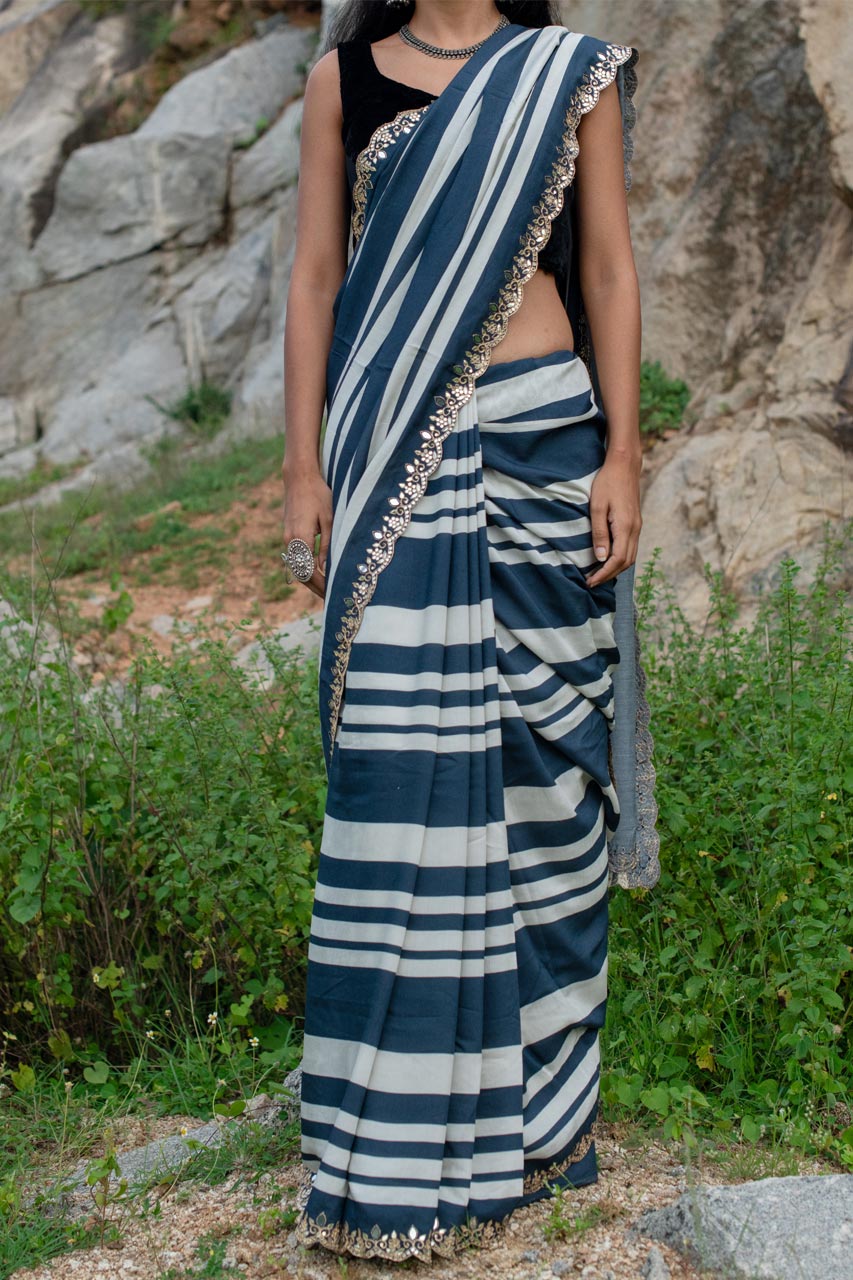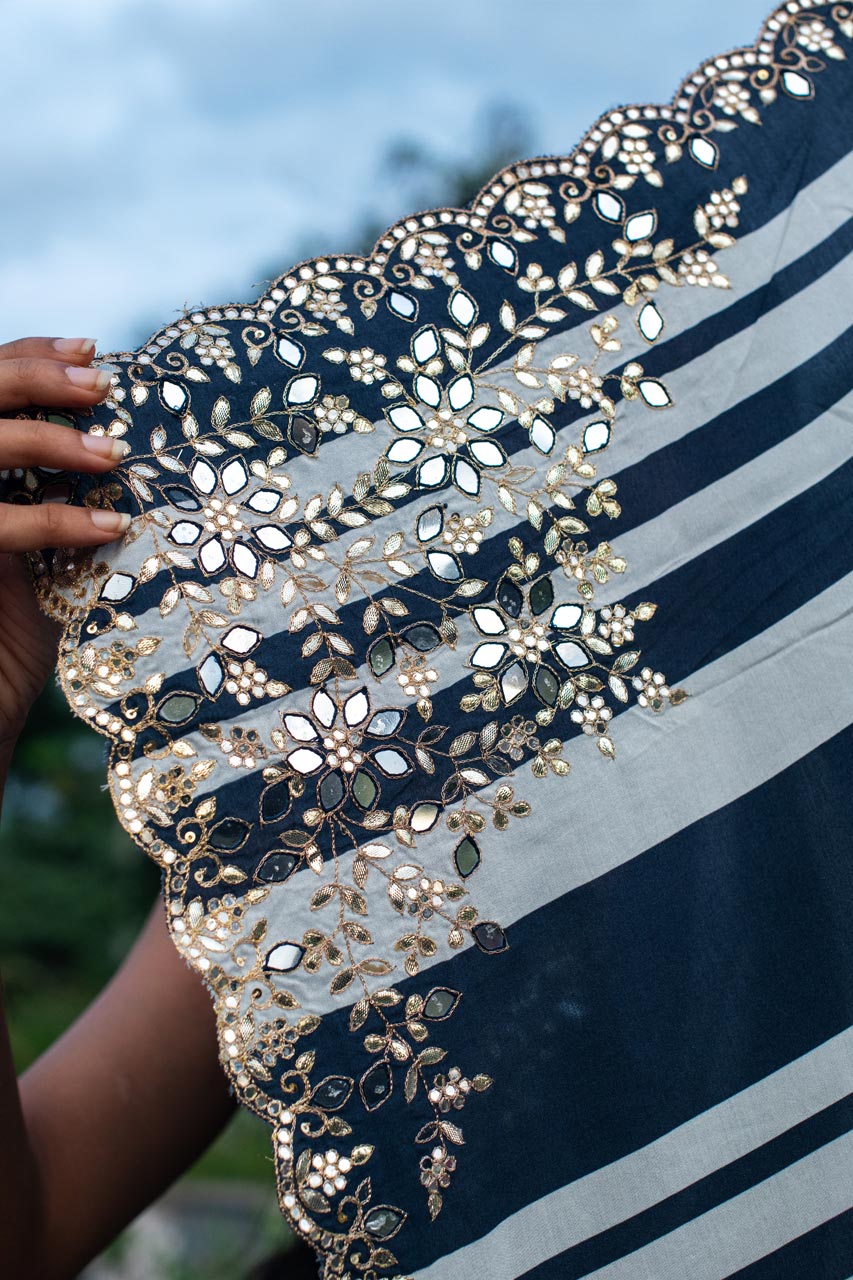 Indulge in the grace of our Soft Muslin Silk Saree, featuring elegant stripes in shades of Indigo. The exquisite aari and mirror handwork on the border, with a scallop end, adds a touch of sophistication to this classic piece. Perfect for elevating your style for any special occasion.