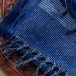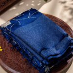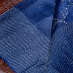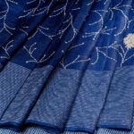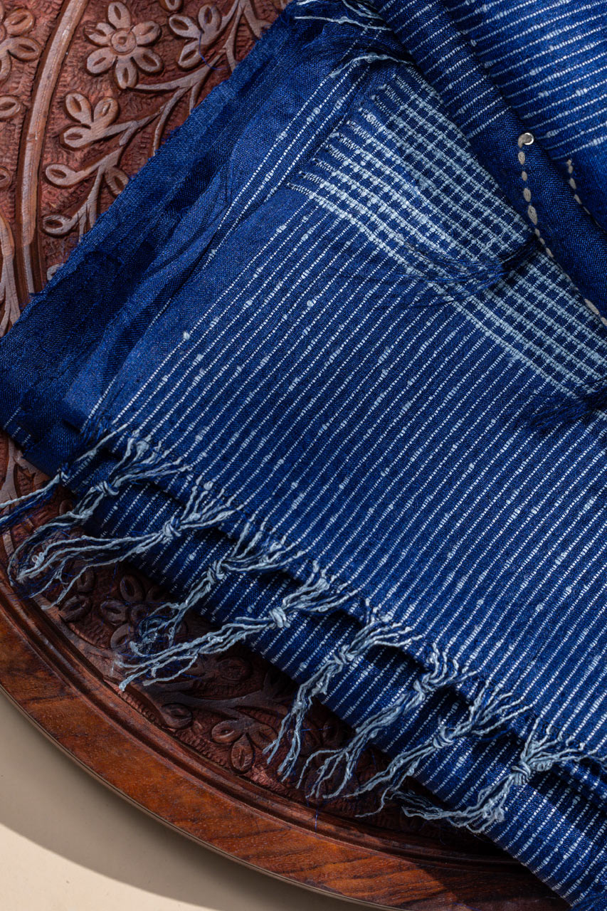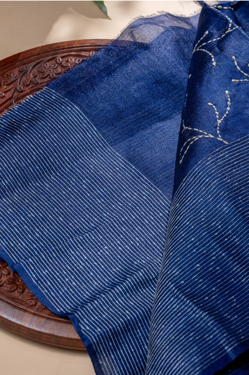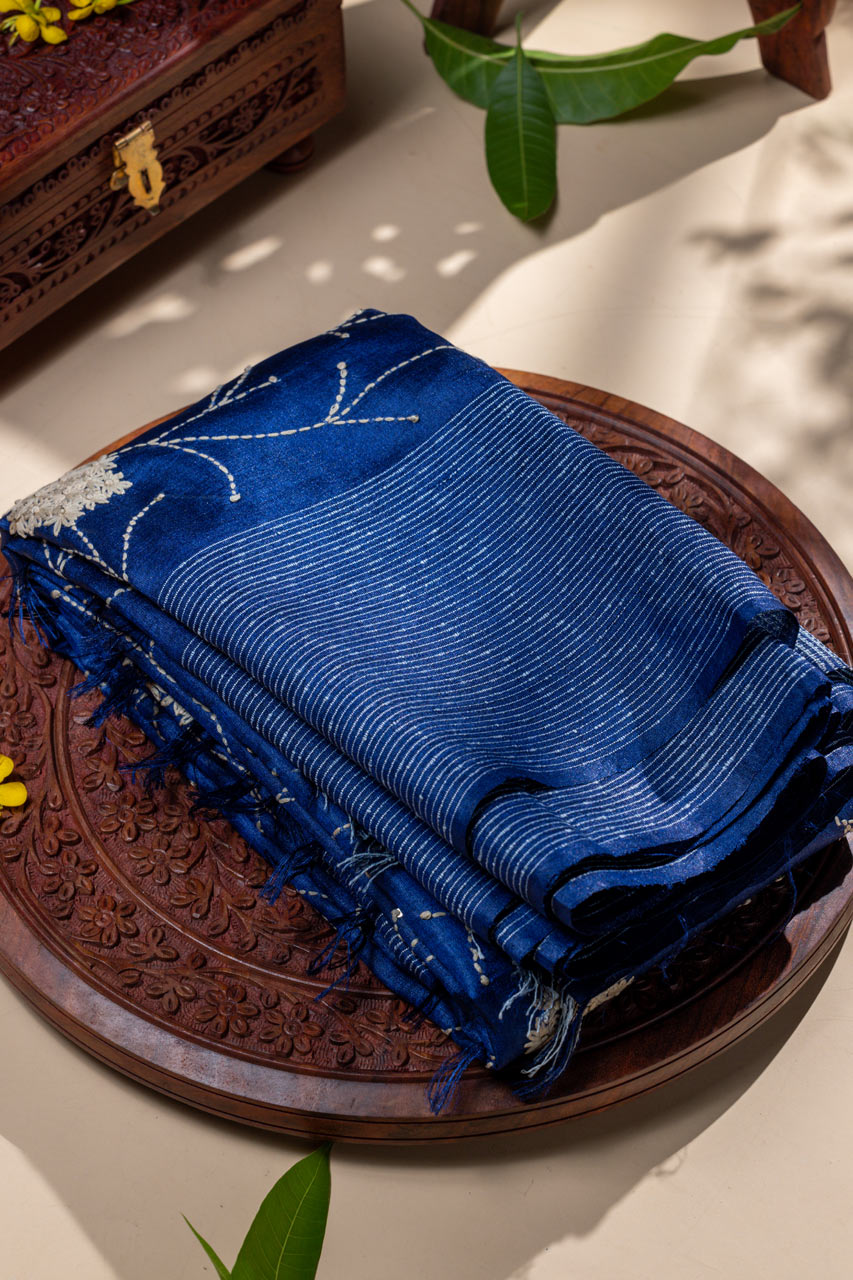 This Deep Blue Pure Tussar Saree celebrates intricate handwork, featuring beautiful Kantha work and floral embossed handwork with sequins. The woven striped pallu with tassels gives the saree a balanced elegance. The blouse is plain with a matching border, complementing the design of the saree, making it perfect for formal and festive gatherings.