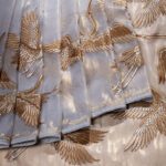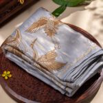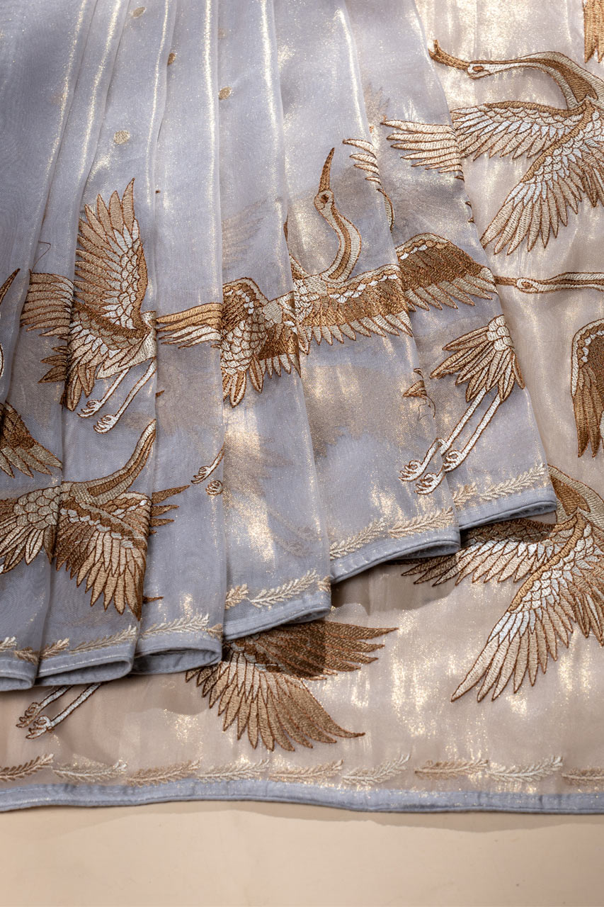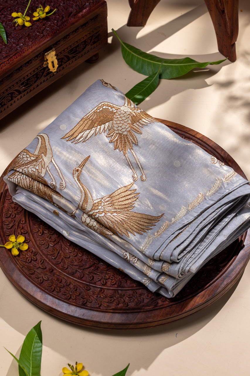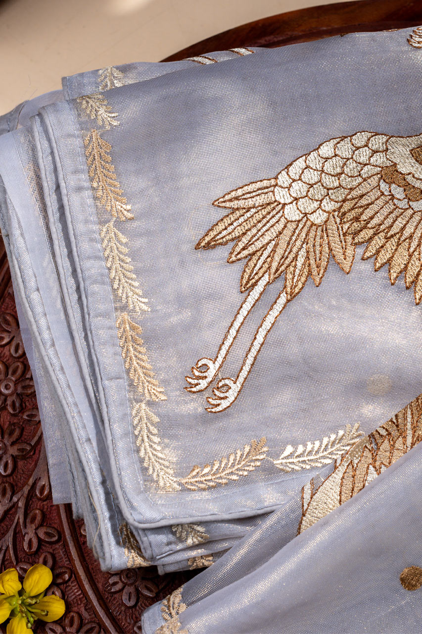 This Soft Tissue Silk Saree in Silver showcases all-over embroidery with graceful swan embroidery. The saree is adorned with butis that add texture and interest to the design, while the self-colored pallu is enhanced with heavy work. The embroidered border with piping finishes the design beautifully, making this saree an elegant choice for both casual and formal events.