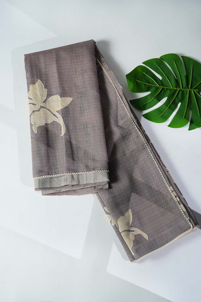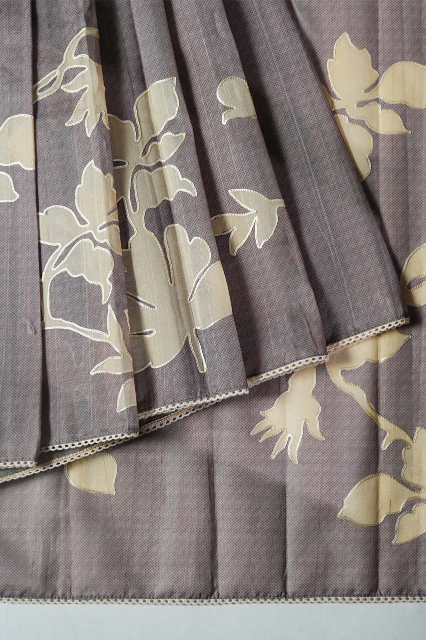 Elevate your style with this exquisite Tussar Saree in a subtle grey hue, adorned with intricate appliqué work outlined in Kashida embroidery. The saree is beautifully finished with a cotton lace border, exuding understated elegance. The pallu features heavy detailing, making it perfect for special occasions.
