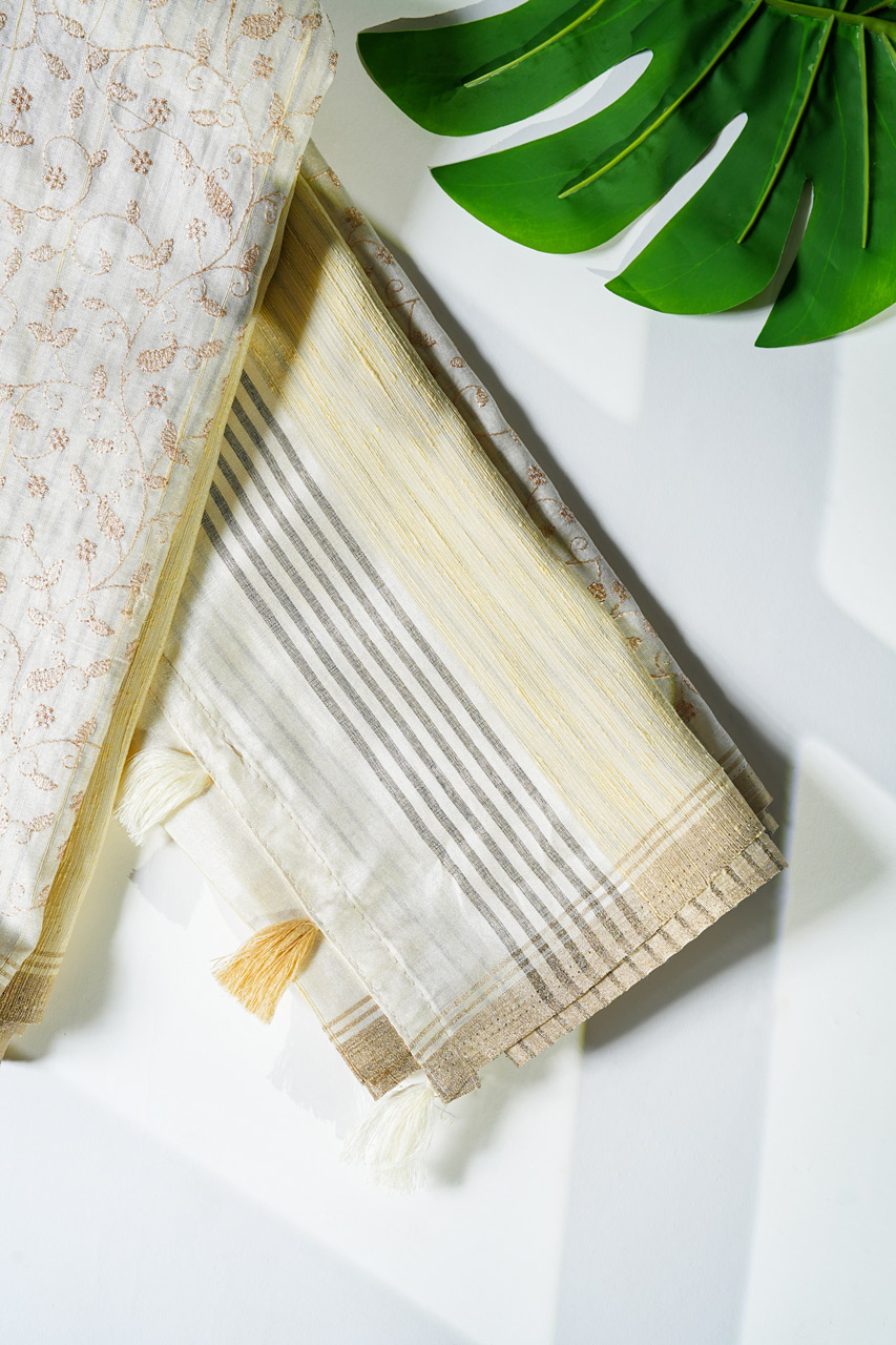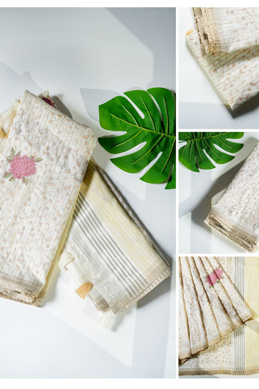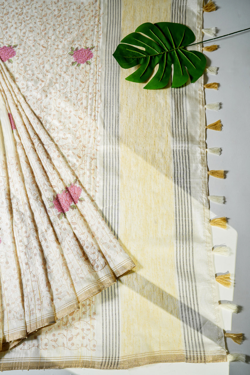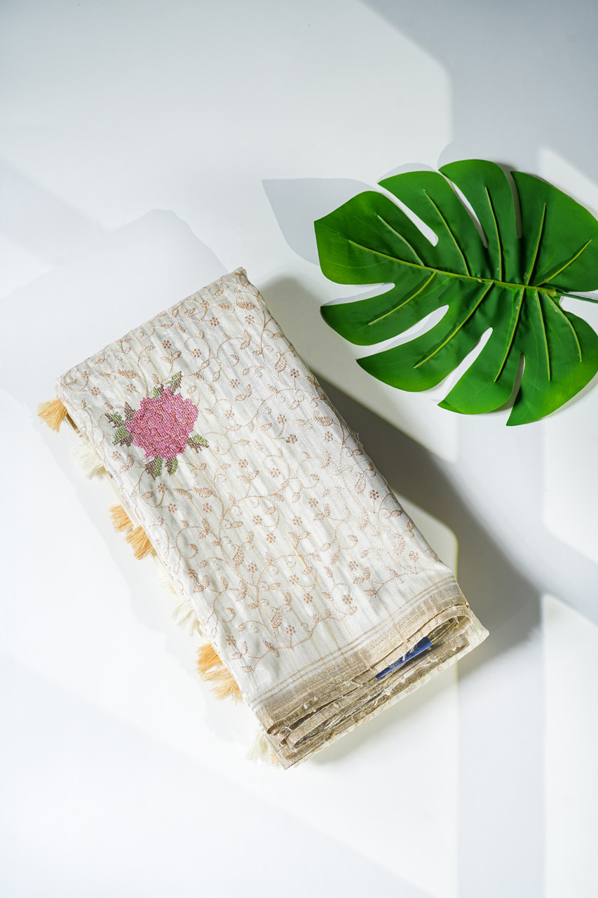Tussar Saree with Chikankari and Cross-Stitch Floral Motifs