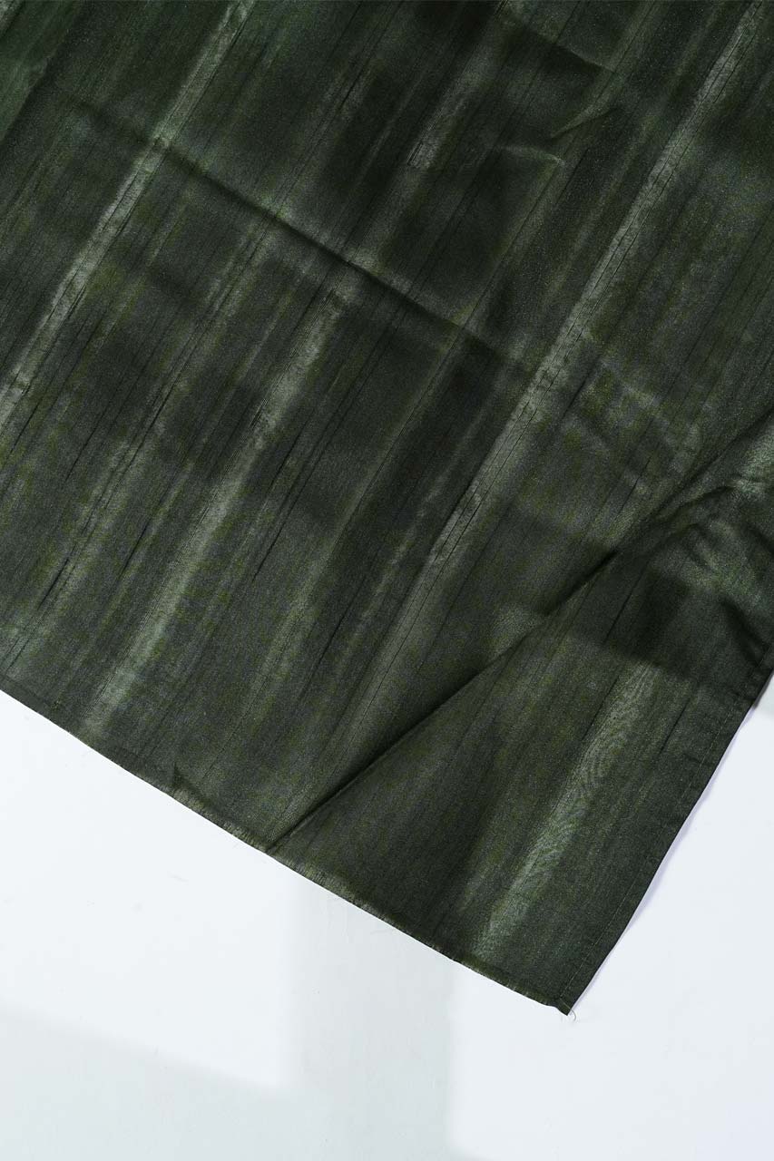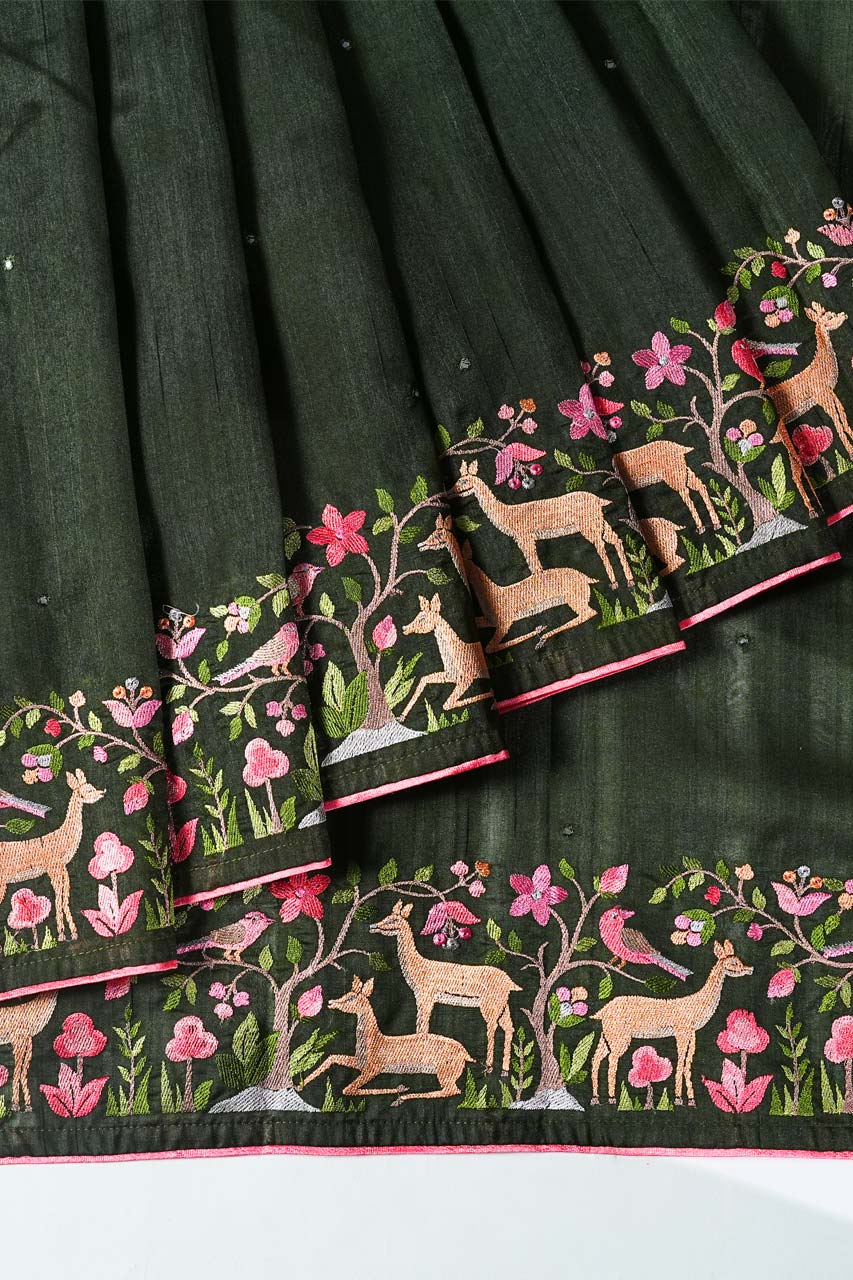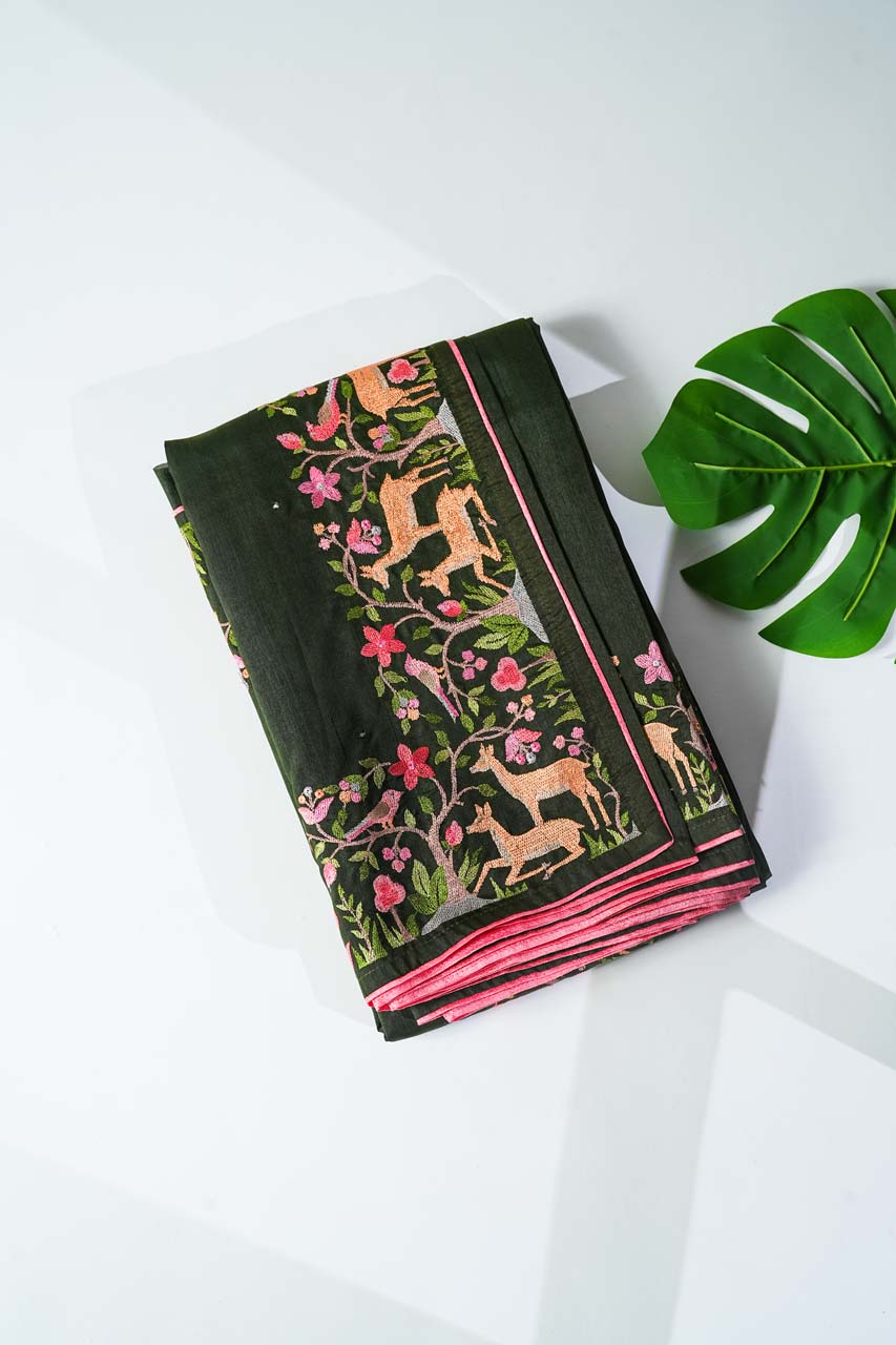 Grace every occasion with this exquisite Tussar Saree, featuring a rich dark bottle green hue adorned with intricate Shikara embroidery border and delicate mirror work. The subtle half-inch contrast piping adds elegance, while the self pallu with border completes the timeless look. Paired with a plain blouse featuring a matching border, this saree is perfect for sophisticated gatherings.