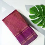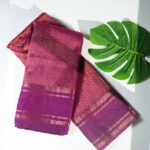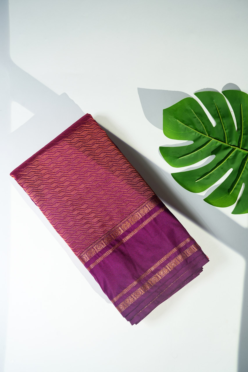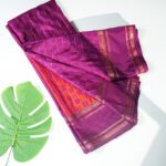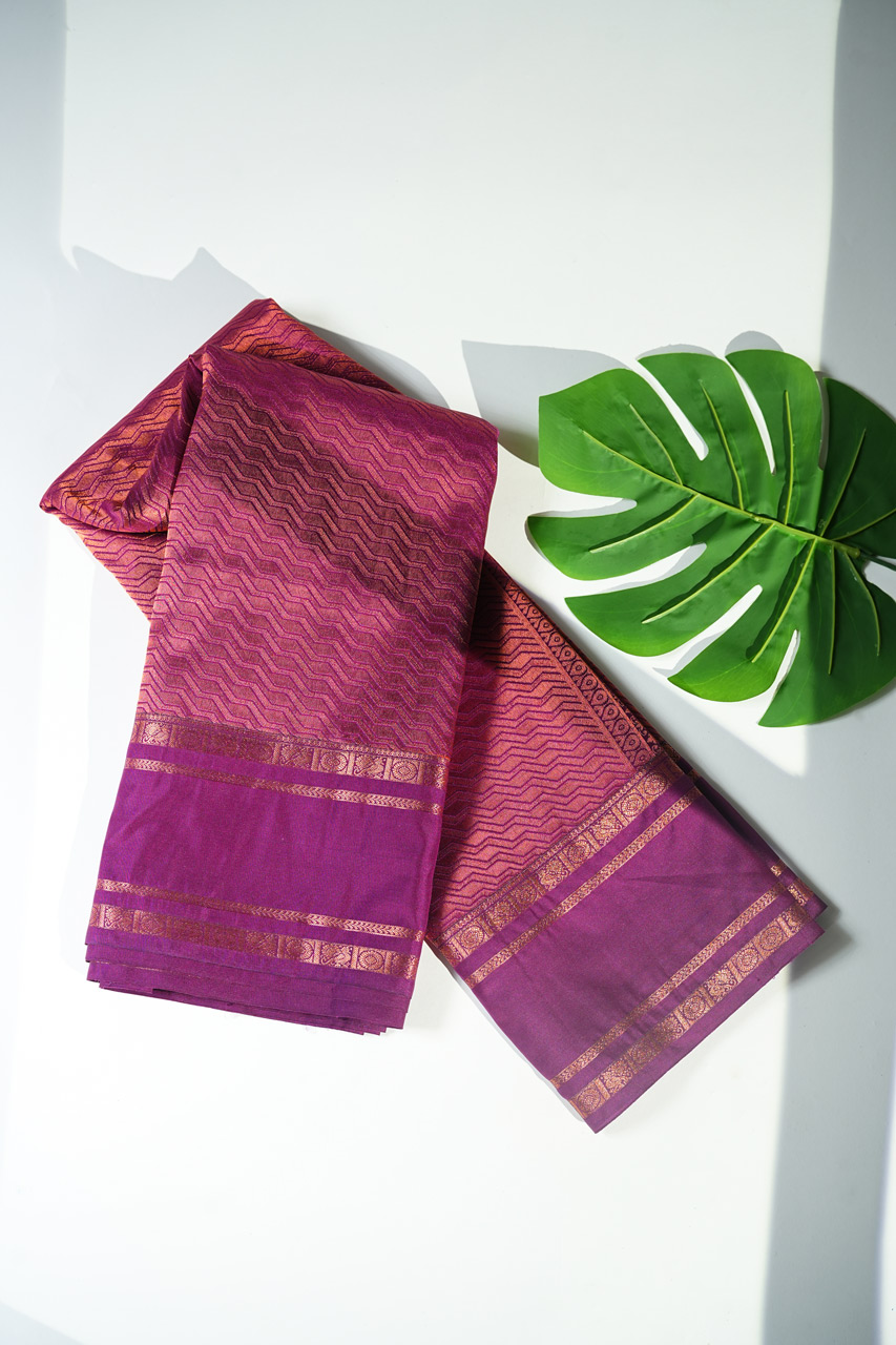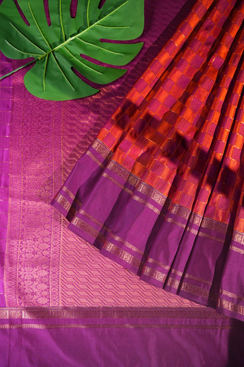 Celebrate timeless tradition with this exquisite Pure Vegan Silk Saree. Featuring a captivating rust orange hue with a rich dark purple contrast, the saree is adorned with a traditional chakra design. The dark purple pallu boasts an elegant self-weaving pattern with tassels, while the dark purple blouse with checks and a traditional gap border completes the ensemble. A perfect choice for those who value sophistication and heritage.